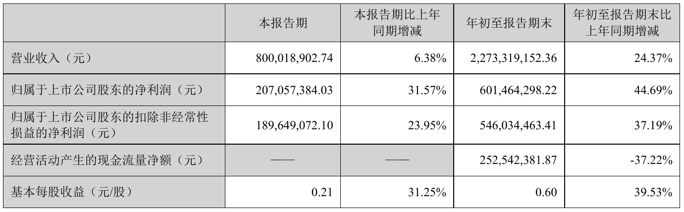 10月21日,国瓷材料(300285)近日发布2021年前三季度报告,报告期内营业收入2,273,319,152.36元,同比增加24.37%;净利601,464,298.22元,同比净利增加44.69%。
