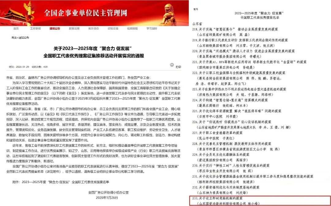 2月4日,全国厂务公开协调小组办公室公布了2023-2025年度“聚合力促发展”全国职工代表优秀提案名单,国瓷工会提报的《关于设立即时奖励机制的提案》成功入选,全市仅有2个提案入选。