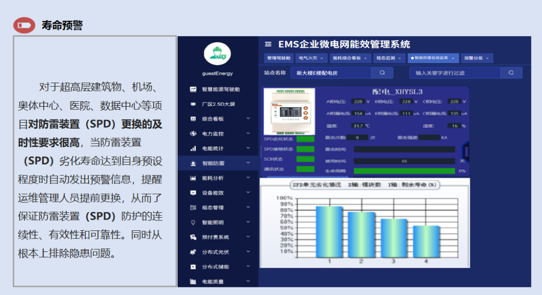 针对超高层建筑、数据中心、机场等对防护连续性要求极高的场景,系统实时监测SPD劣化状态,当达到预设寿命阈值时自动发出预警,提醒提前更换,避免因设备失效导致防护中断。