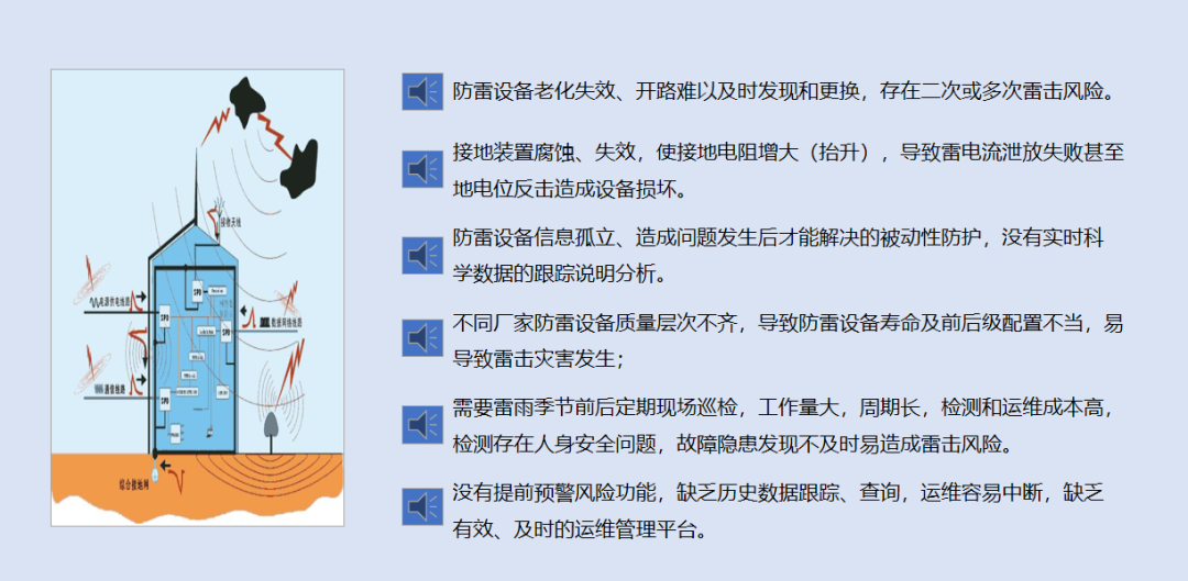 传统防雷主要依赖接闪器、浪涌保护器(SPD)和接地装置,但在实际运行中暴露出一系列痛点: