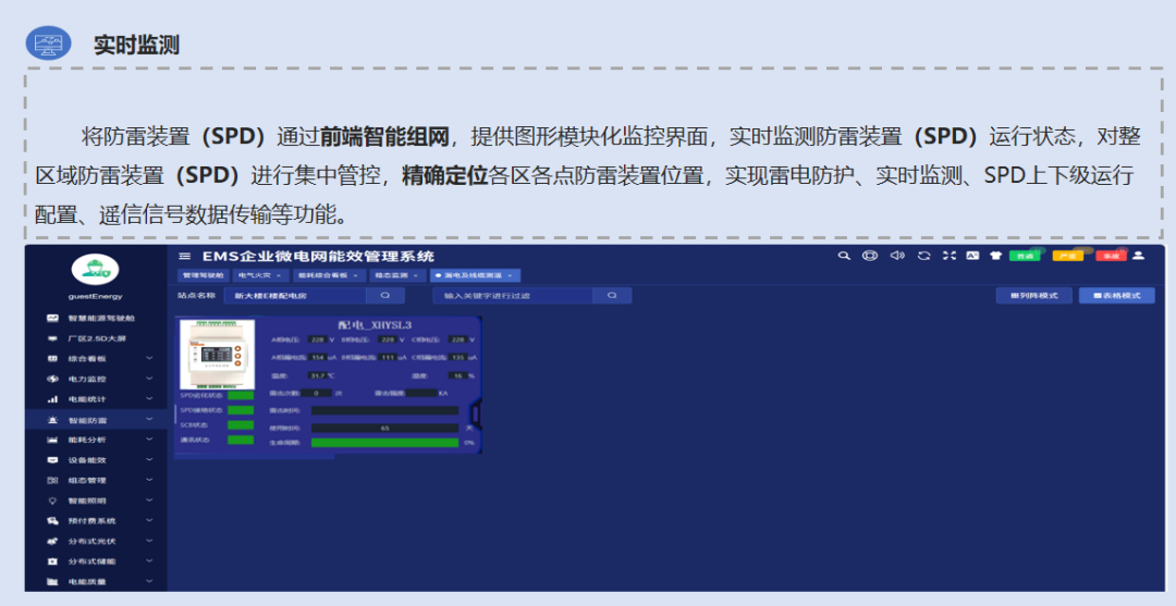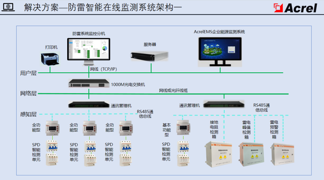 用户层:防雷系统监控分机与AcrelEMS能源监测系统联动,以图形化界面直观展示全线防雷态势,支持数据查询、打印与多级预警。