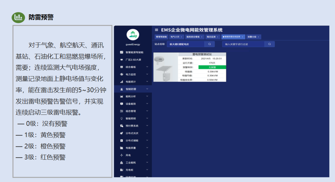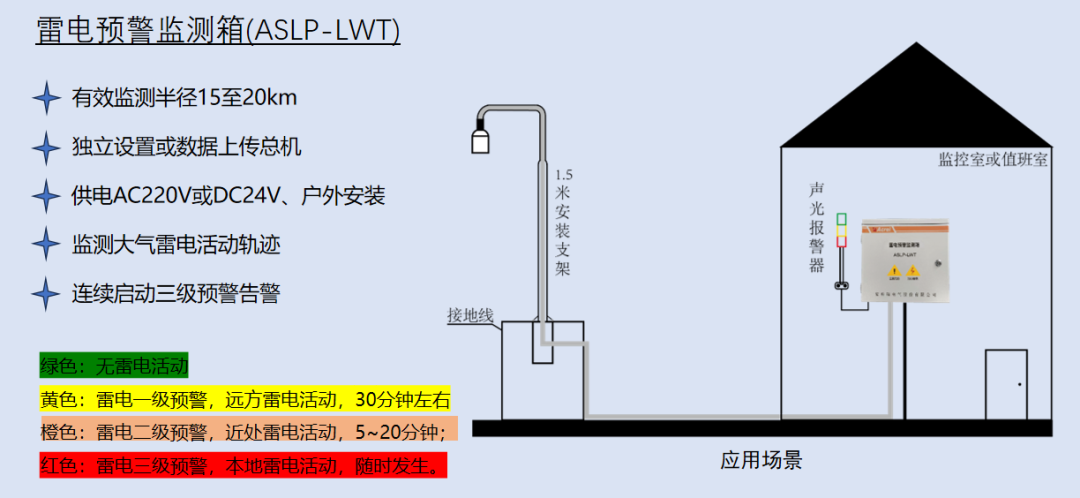 系统连续监测大气电场强度,能在雷击发生前的5~30分钟发出三级雷电预警(黄色/橙色/红色),为石油化工、易燃易爆场所等高风险场景争取宝贵的应对时间。
