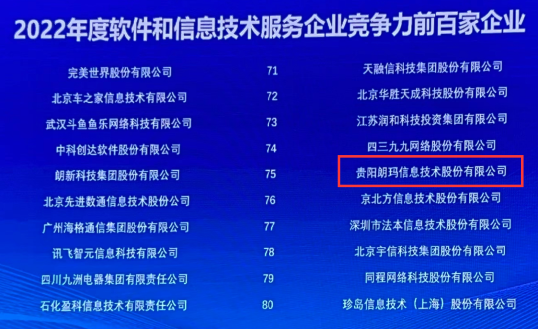 2月17日,中国电子信息行业联合会在北京组织召开了首届中国数据治理年会,期间,发布了“2022年度软件和信息技术服务企业竞争力报告及前百家企业”榜单。其中,朗玛信息凭借在互联网、大数据领域的技术及产业优势,再度登榜!系贵州省内唯一一家入选企业。