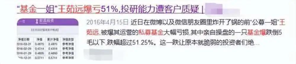 自信心爆棚的王茹远很快离开公募行业,自己搞起了私募,在2014年成立了上海宏流投资管理有限公司。2015年-2016年期间,有媒体报道她亲自操盘的私募产品爆亏50%以上。还有传言称,王茹远帮潮汕帮炒股巨亏50亿元,后来她又通过朋友圈对此事进行了澄清。