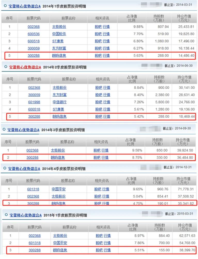 进一步看,在2014年一季度、二季度、三季度、四季度、2015年一季度,朗玛信息分别位列第五大重仓股、第五大重仓股、第二大重仓股、第三大重仓股、第三大重仓股。
