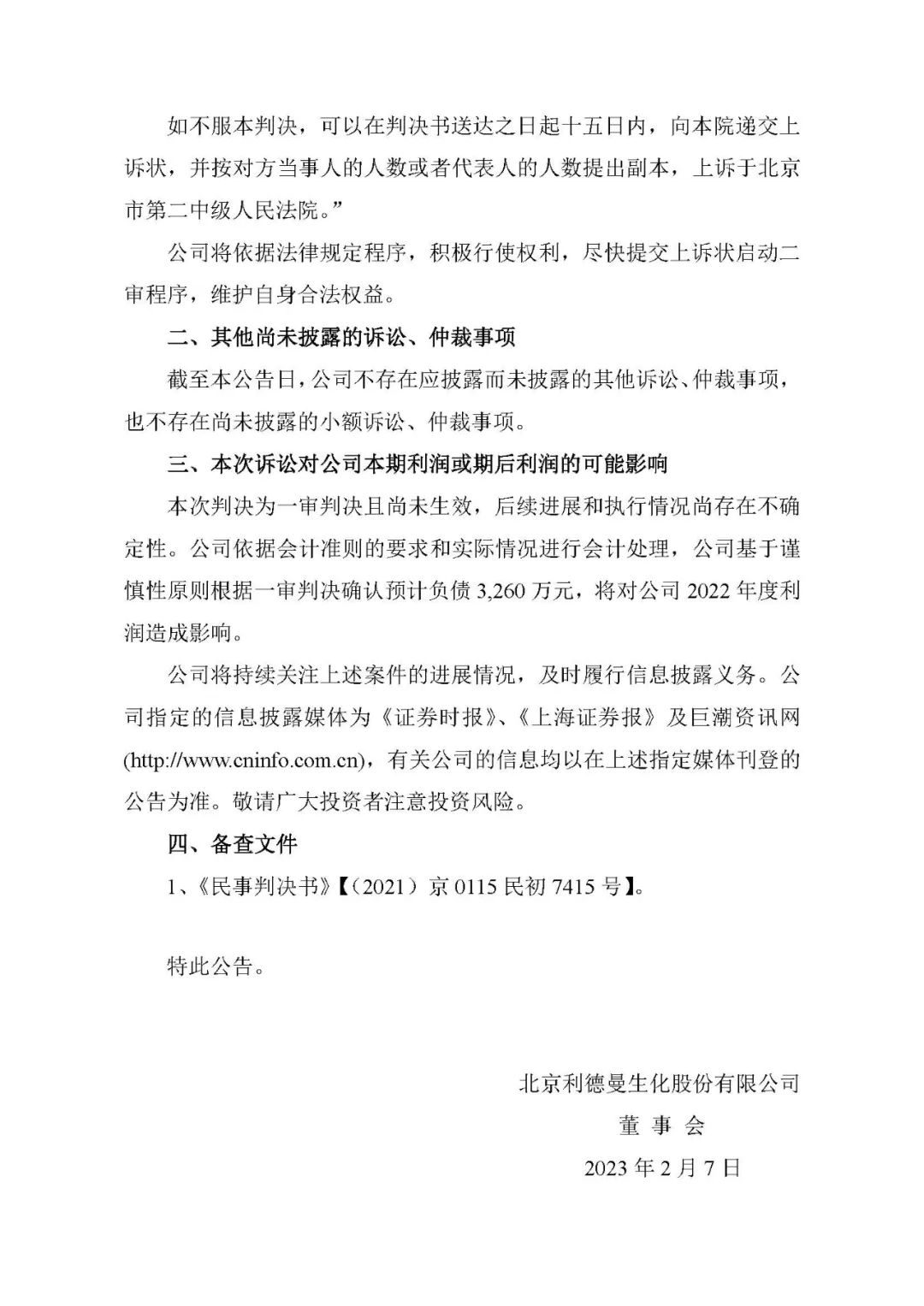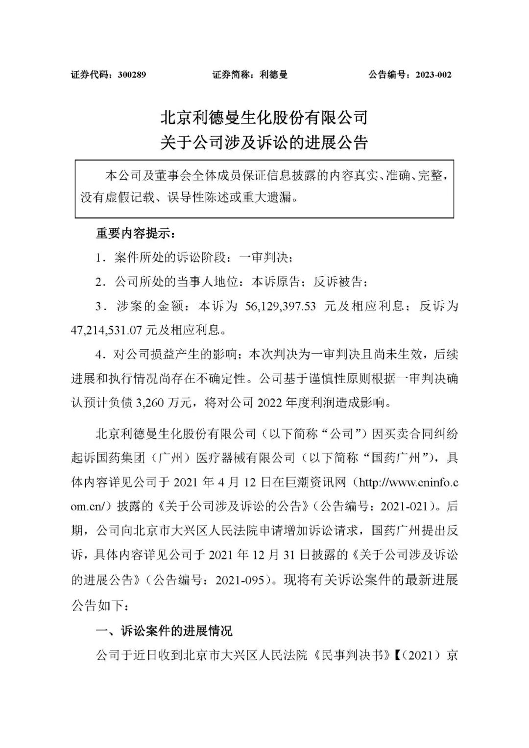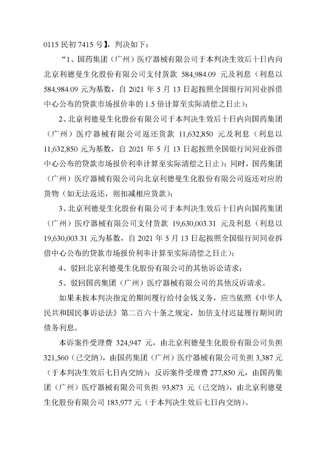 2021 年 4 月 9日,利德曼起诉国药集团(广州)医疗器械有限公司买卖合同纠纷一案获受理。2021年12月31日,被国药集团反诉。近日一审宣判。