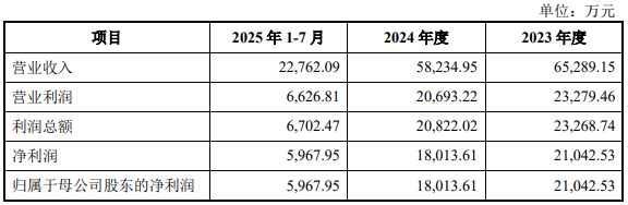 标的公司去年营收净利双降。2023年度、2024年度、2025年1至7月,标的公司营业收入分别为65,289.15万元、58,234.95万元、22,762.09万元,净利润/归属于母公司股东的净利润分别为21,042.53万元、18,013.61万元、5,967.95万元。