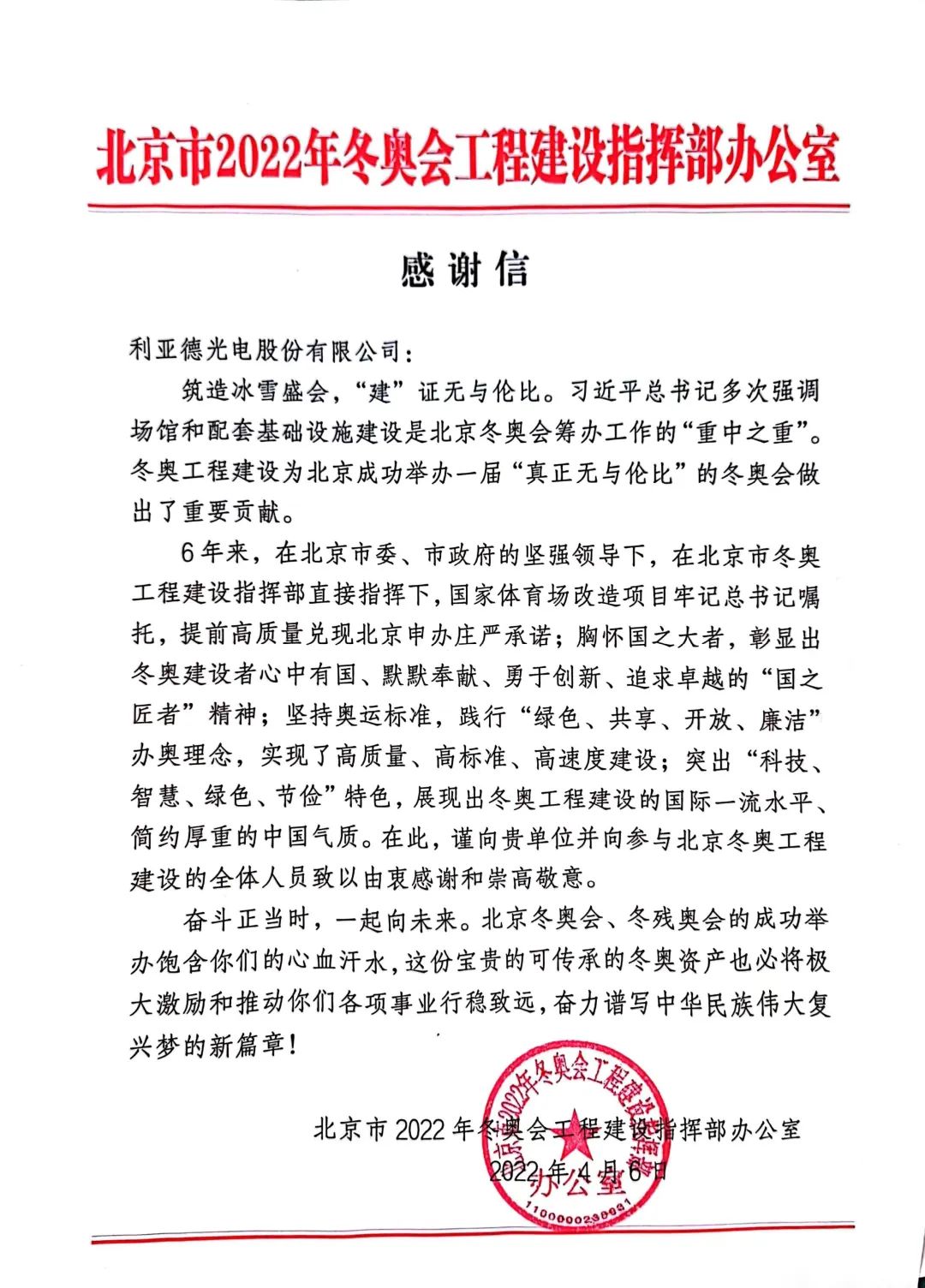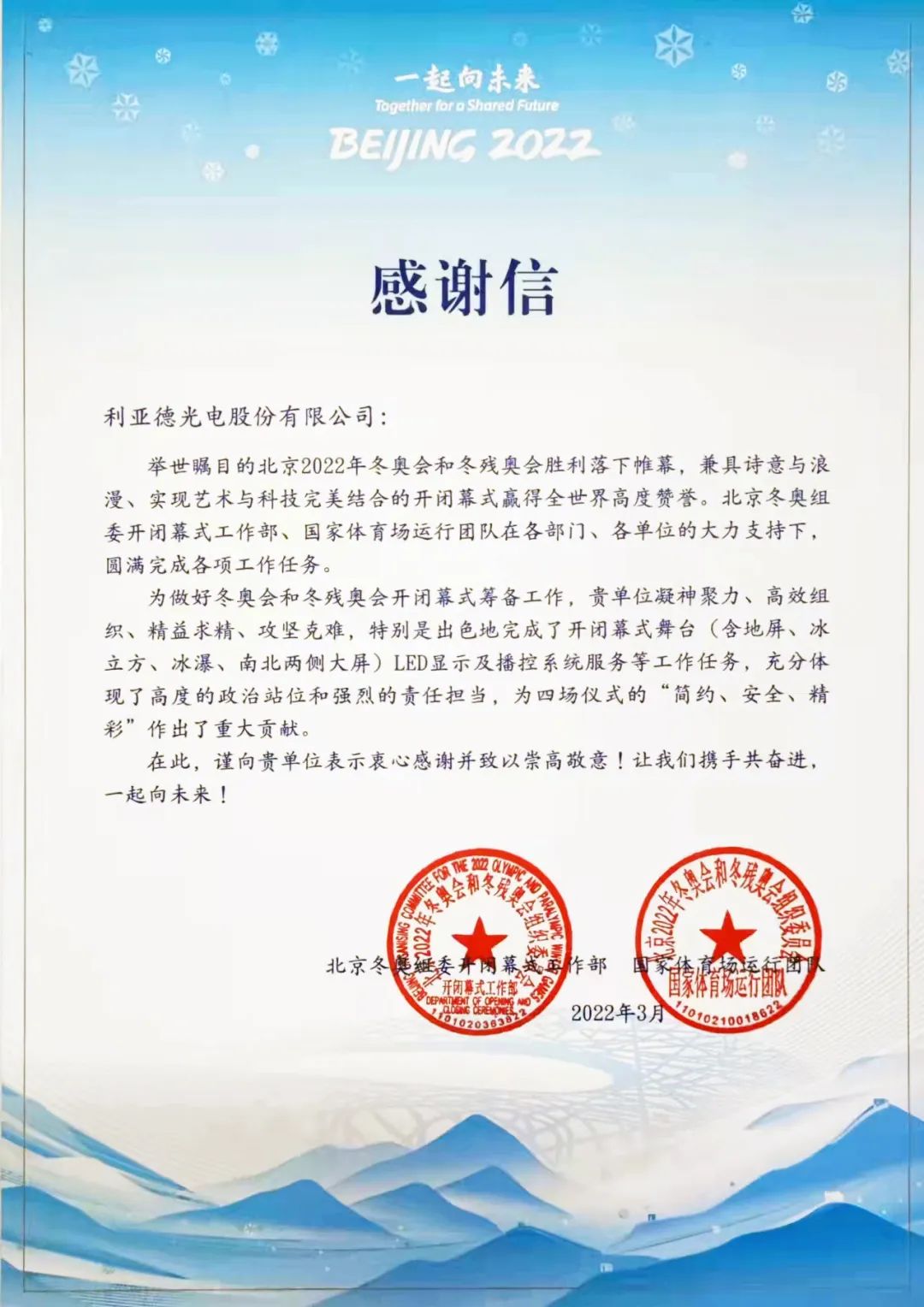 冬奥会工程建筑指挥部办公室致信利亚德,“冬奥工程建设为北京成功举办一届‘真正无与伦比’的冬奥会做出了重要贡献,在此向利亚德及参与北京冬奥工程建设的全体人员致以由衷的感谢和崇高的敬意。”