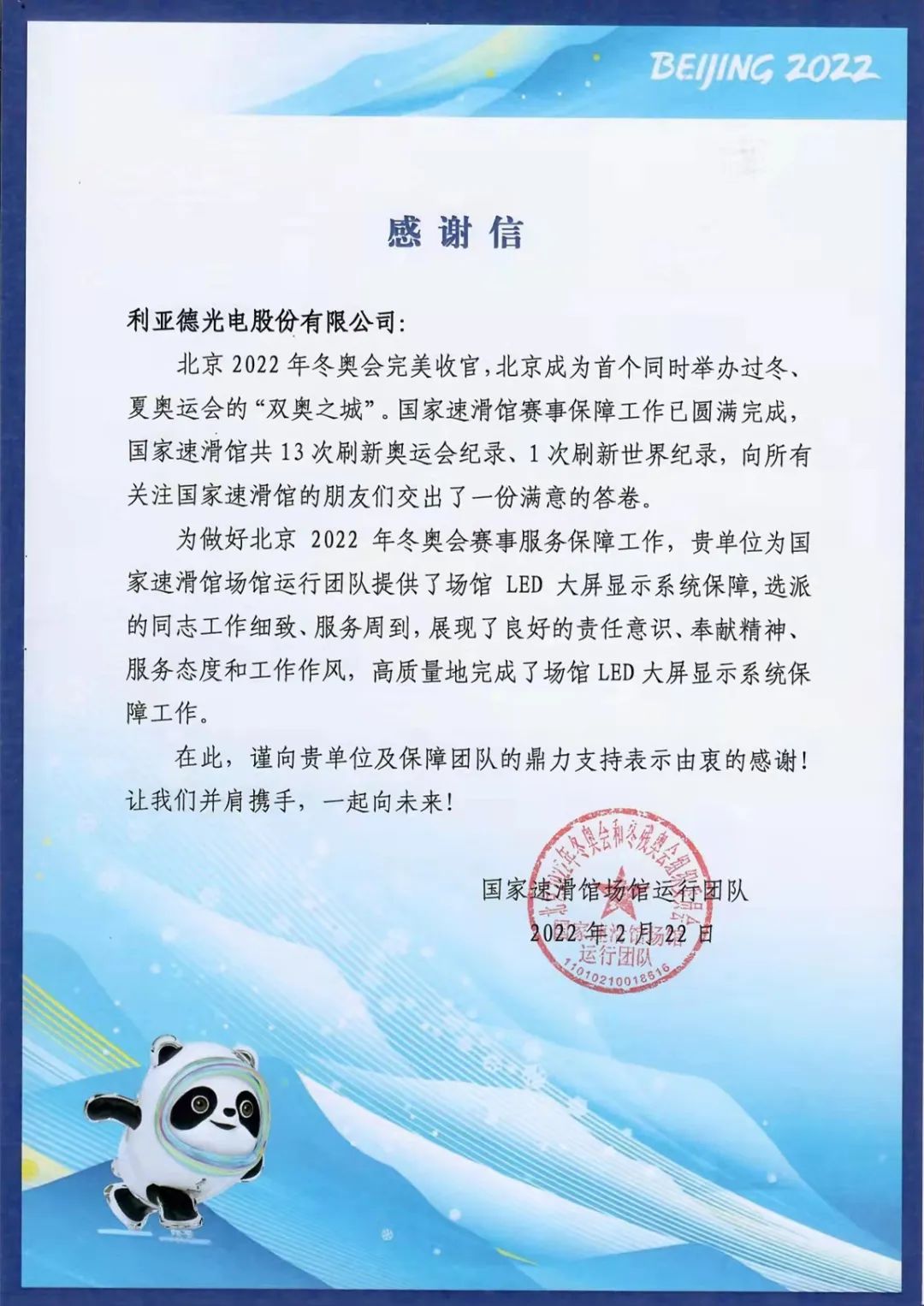 国家速滑馆场馆运行团队表示,“为做好北京2022年冬奥会赛事服务保障工作,利亚德为国家速滑场馆运行团队提供了场馆LED大屏显示系统保障,选派的同志工作细致、服务周到,展现了良好的责任意识、奉献精神、服务态度和工作作风,高质量地完成了场馆LED大屏显示系统保障工作。在此,谨向利亚德及保障团队的鼎力支持表示由衷的感谢,让我们并肩携手,一起向未来。”