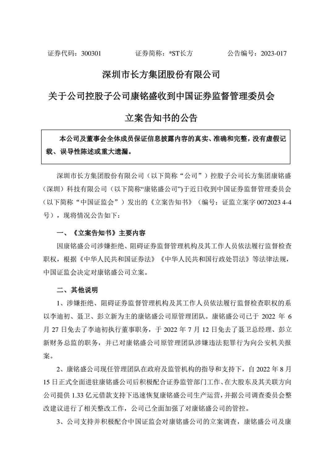 2023年2月6日晚间,长方集团发布公告,其控股子公司康铭盛公司被中国证监会正式立案调查。