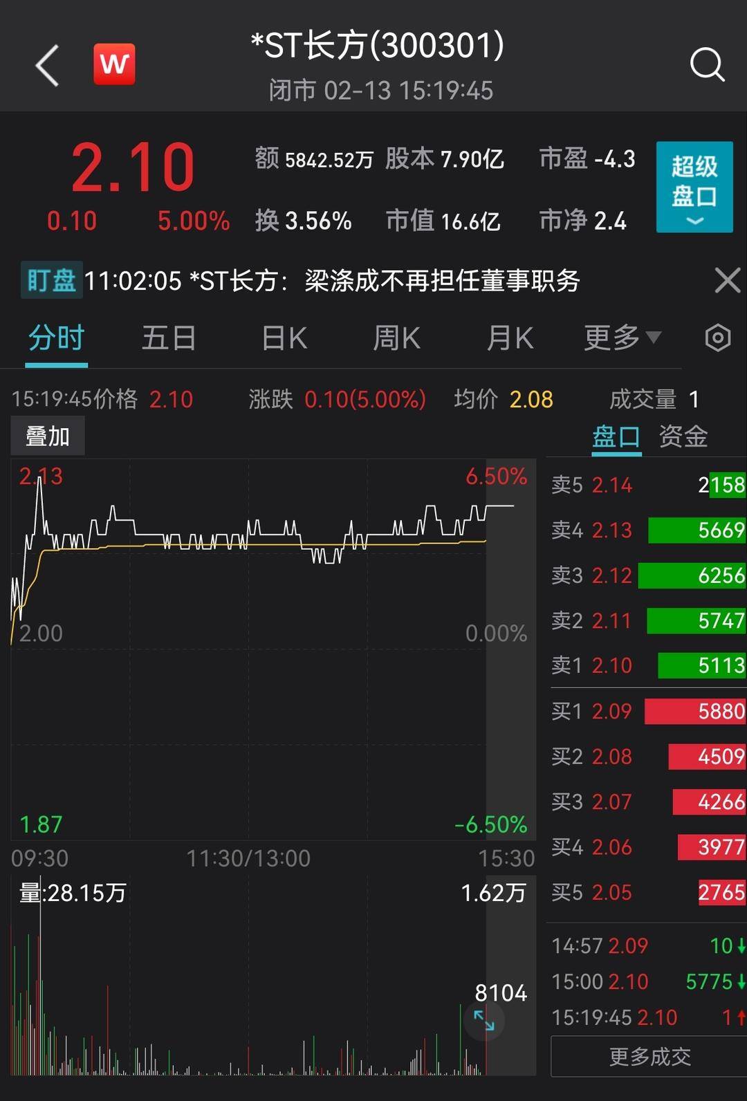 截至2月6日收盘,ST长方每股报1.9元。近一年股价跌幅超44%,公司最新市值为15亿元。