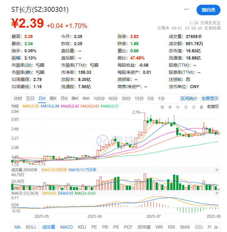 8月1日,截至10:28,ST长方(300301.SZ)股价涨1.7%,报2.39元/股,总市值为19.83亿元。