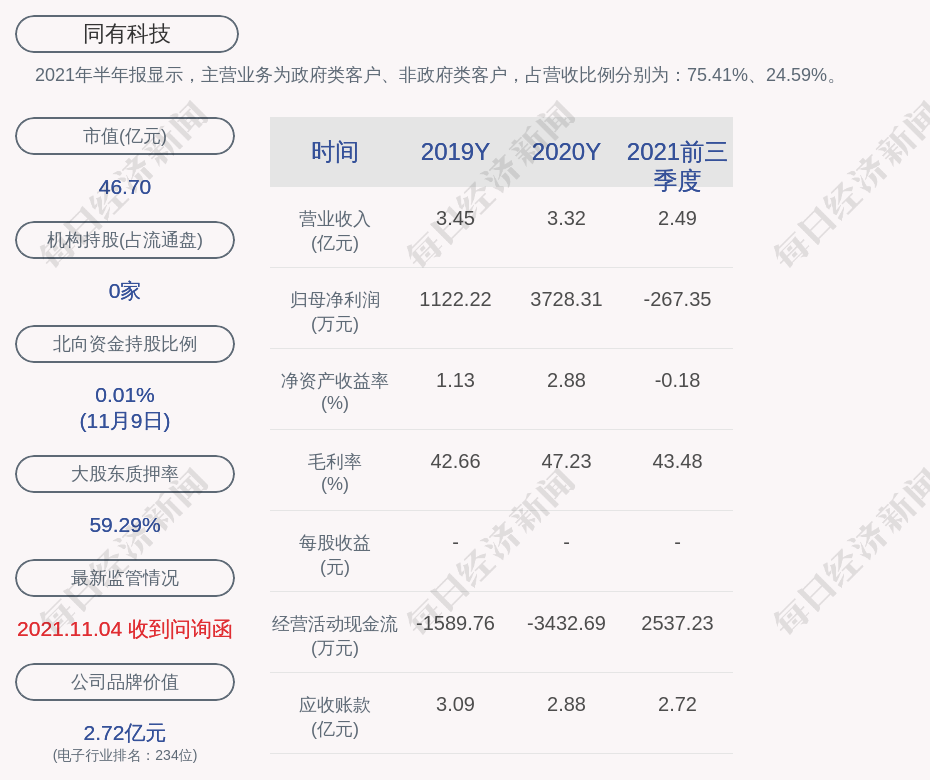 2021年半年报显示,同有科技的主营业务为政府类客户、非政府类客户,占营收比例分别为:75.41%、24.59%。