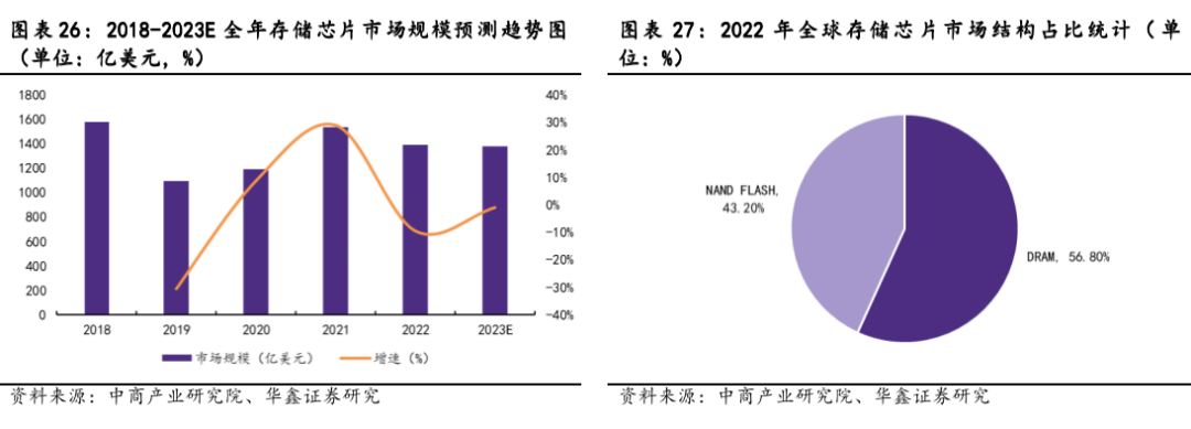 根据中商产业研究院,2022年半导体行业整体承受下行的压力,主要原因是全年全球经济增速放缓并且叠加通胀上升,用户消费信心受到经济疲软所影响。在全球消费疲软的环境下,企业实行降价和缩减产能来应对库存压力,市场规模相比2021年有所下降。2022年全球存储芯片市场规模约1392亿美元,同比下降9.5%,并且预计2023年全球存储芯片市场规模将减少到1379亿美元。其中,DRAM 2022年市场规模为790.61亿美元,占比存储芯片的56.8%。NAND FLASH 2022年市场规模为601.26亿美元,占比存储芯片的43.2%。