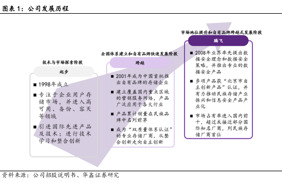 公司自1998年成立起,大致经历了“起步”、“跨越”、“腾飞”三个发展阶段,并一直专注于数据存储、数据保护、容灾等领域,凭借雄厚的技术实力、出色的产品品质和突出的经营业绩,已成为国内领先的民族存储厂商。