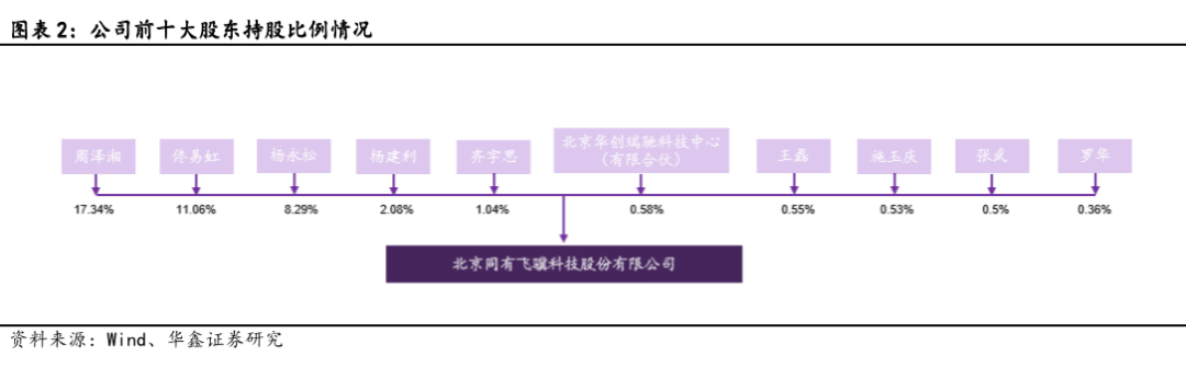 公司股权结构较为分散,前十大股东持股42.33%。公司法定代表人及最终受益人为董事长周泽湘,通过直接持股17.34%。佟易虹、杨永松、杨建利、齐宇思分别直接持股11.06%、8.29%、2.08%、1.04%。王锐、丁振康、杨海奎等17名股东通过北京华创瑞驰科技中心(有限合伙)间接持有公司股份0.58%。王磊、施玉庆、张武、罗华分别直接持股0.55%、0.53%、0.5%、0.36%。
