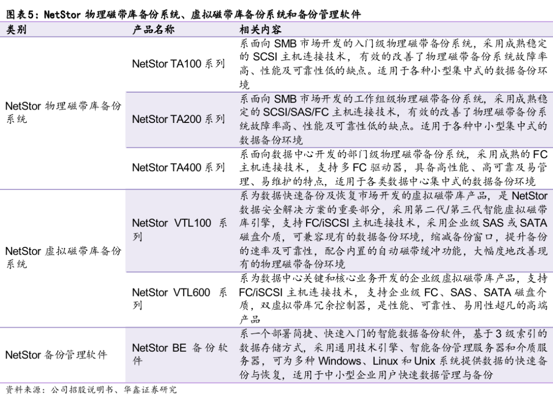 NetStor物理磁带库备份系统系列和NetStor虚拟磁带库备份系统系列是公司软硬件一体化的备份产品,既能直接作为简单的中小企业备份系统,也能作为核心设备为大中型企业构建复杂的数据备份系统。其中,NetStor VTL系列产品于 2009年获得“北京市自主创新产品”认证,强大的性能和独特的设计使其除了能应用于数据保护领域外,还能参与构建容灾系统。此外,公司还提供NetStor BE备份管理软件,满足客户在数据备份和恢复等方面的需求。