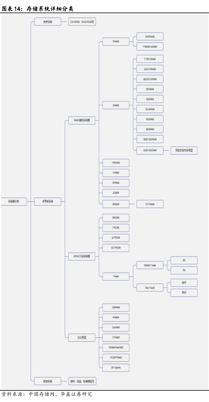 只读存储器(ROM)的特征是不能随意写入信息只读出信息,集成在主板上的ROM里面固化了一个I/O系统,也称为BIOS(基本输入输出系统)。BIOS的主要功能包括系统中各功能模块的初始化工作、对系统的加电自检工作、系统的基本输入输出驱动程序、操作系统的引导工作。ROM在断电后仍旧能存储数据信息,ROM包括OTP ROM、Flash芯片、EPROM/EEPROM,ROM的代表性产品是Flash芯片,其在ROM中的占比最大,其中Flash芯片可以进一步分为NOR FLASH和NAND FLASH。