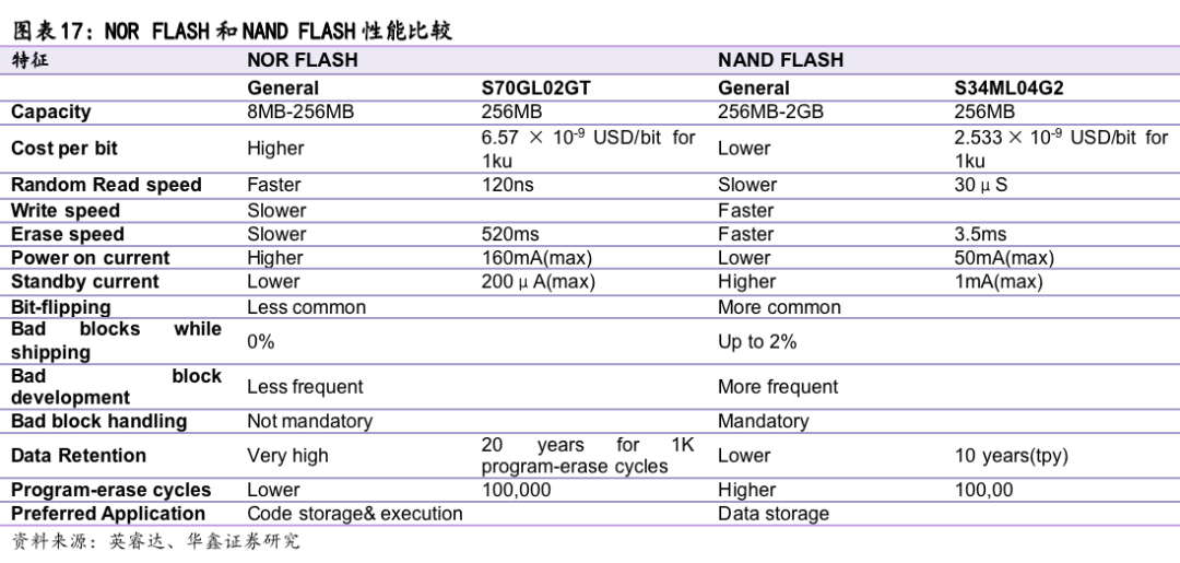 NOR FLASH:是一种代码型闪存芯片,特征包括寿命长、可靠性强,由于地址线和数据线分开,NOR FLASH上可以直接运行应用程序,能够用来存储代码和少量数据。其接口主流是SPI NOR,主流容量是1Mbit至128Mbit,并且尺寸比较小。NOR FLASH的架构决定了其容量天花板很低,并且读取速度比较慢,优势在于不需要建立文件系统,能够直接用地址来访问数据,简单易用。NOR FLASH目前主流的应用场景包括手机摄像头内部、屏幕驱动电路板。