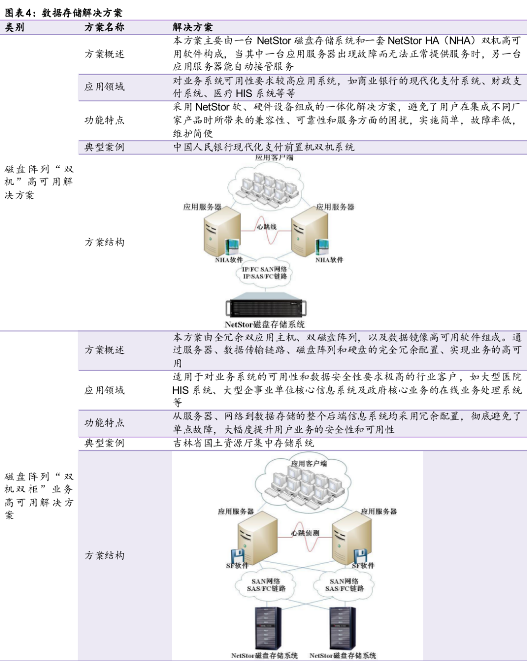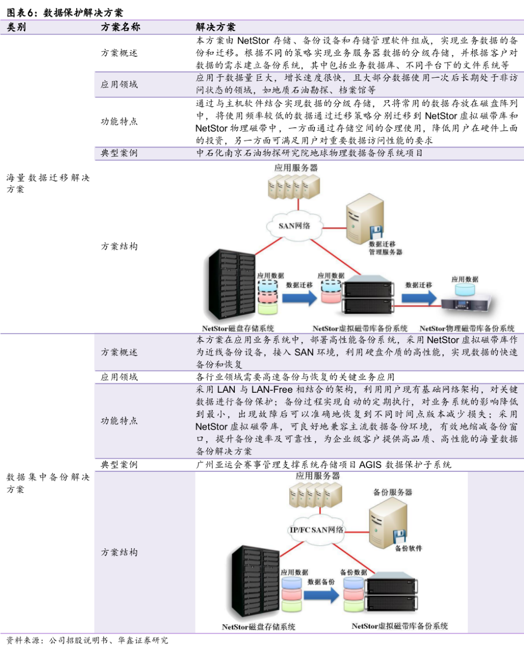 公司除了能够提供 NetStor磁盘存储系统及NetStor存储管理软件等产品外,还根据各行业特性和多年的项目经验总结,形成了多种数据存储解决方案,能够根据用户具体需求和信息系统特点为其提供包括数据存储产品在内的一系列产品组合及相关服务。公司在数据存储领域的解决方案主要包括: