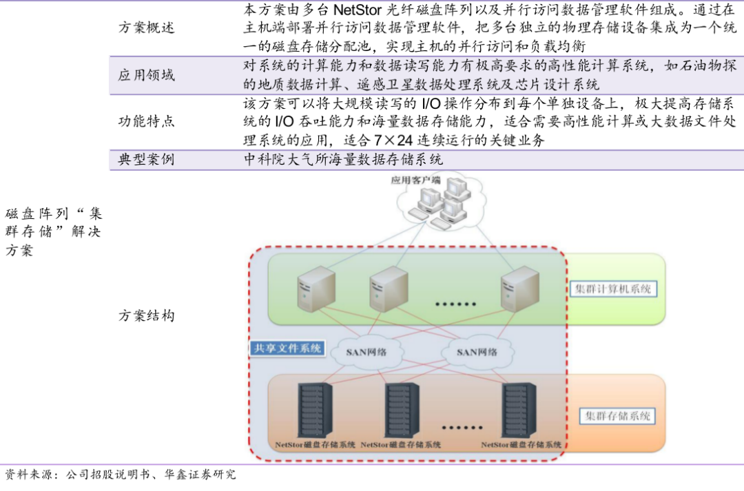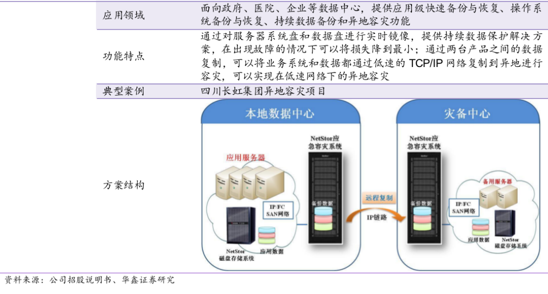 NetStor磁盘存储系统是公司整个业务领域的基础产品和数据存储领域的核心产品:①作为“数据存储仓库”,其能广泛应用于数据保护和容灾等领域,在备份系统和容灾系统中承担存储数据的功能;②在数据存储领域,NetStor磁盘存储系统既能直接作为简单的中小企业数据存储设施,也能作为核心部分为大中型企业构建复杂的数据存储系统。除NetStor磁盘存储系统外,公司还提供多种存储管理软件,满足客户在存储数据管理和数据高可用等方面的需求。NetStor iSUM 系列产品于 2009 年获得“北京市自主创新产品”认证;2011 年,随着云计算和虚拟化技术的发展,公司适时推出了领先的NCS云存储系列产品,该系列产品主要针对大数据中心云计算业务中海量数据的并发访问、查询、存储、保护以及异地容灾,有效满足云计算对数据传输、处理和保护的特殊要求。