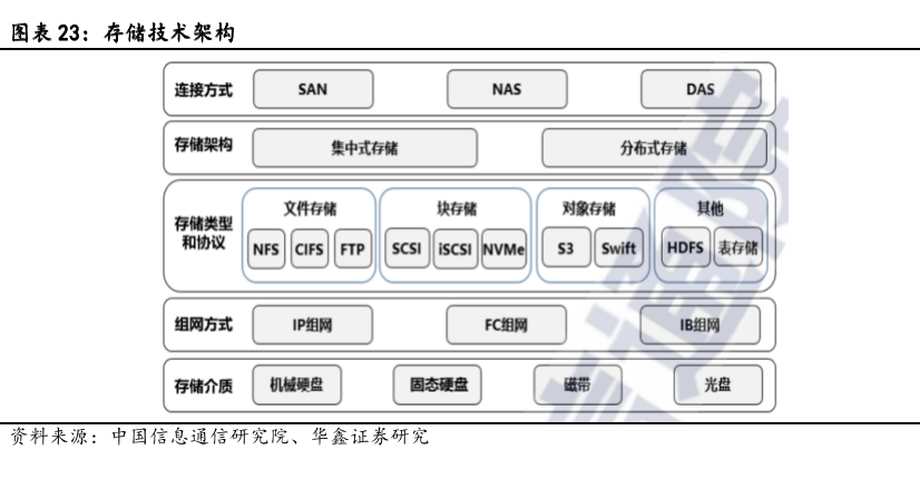 目前现有的存储技术从底层到上层总共分为5大部分,包括存储介质、组网方式、存储协议和类型、存储架构、连接方式。