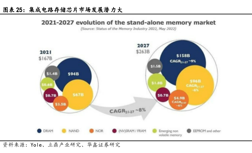 全球存储器市场2021-2027年年复合增速为8%。根据Yole,全球存储器的市场规模预计将从2021年的1670亿美元上升到2027年的2630亿美元,其CAGR为8%。从细分市场来看,2027年DRAM将在全球集成电路存储芯片市场中占据最高份额,将以1580亿美金的市场规模继续领跑存储芯片细分市场,大约能够占据50%以上的存储芯片市场,其CAGR约为9%。在2027年的全球集成电路存储芯片市场中,NAND FLASH市场可以预计可以达到960亿美元,GAGR约为6%,NOR FLASH预计可以达到49亿美元,市场份额相比较少,CAGR约为6%。