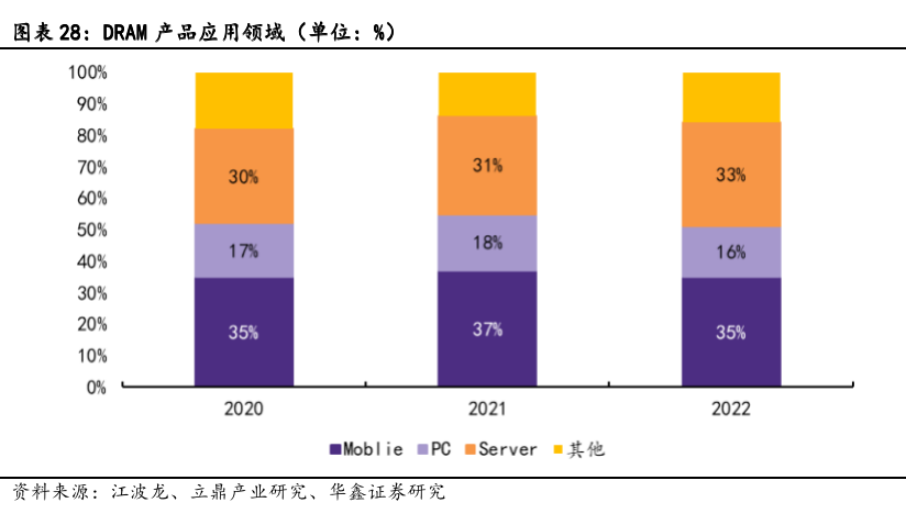 DRAM的市场集中度更高,市场价格和总体规模受存储原厂的产能规划的影响较大,DRAM主要供应商的产能布局和市场需求间的动态平衡比较脆弱。LPDDR和 Server DRAM(RDIMM为主)占据DRAM市场中的多数份额,这两类产品的市占率可以总计达到65%以上。