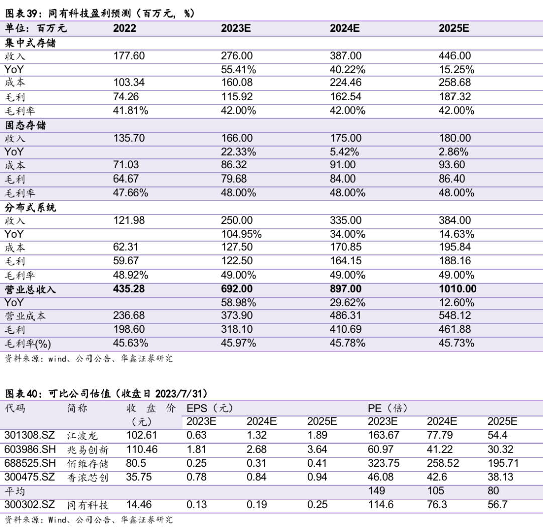 综上,我们预计公司2023-2025年有望分别实现6.92/8.97/10.10亿元收入,0.62亿、0.93亿、 1.27亿元归母净利润,对应111.5/73.8/54.2倍PE。考虑公司分布式系统业务及固态存储业务在手订单充沛,预计收入利润有望高增,给予公司“买入”评级。