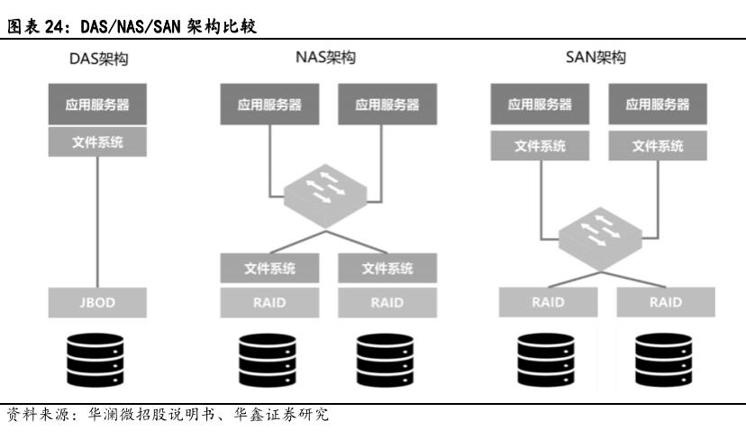 存储区域网络主要指存储设备通过光纤交换机等网络设备和通信设备协议与服务器互联的高速存储专用网络。光纤通道、SCSI、ESCON、接口;光纤交换机、网关、光纤路由器、光纤集线器等网络连接设备;IP、SCSI等通信控制协议三大部分构成了SAN结构。在光通道下,SAN提供了一个专用、高速、高可靠性的存储网络,在增加存储容量方面可以独立添加,相比于DAS,能够更加集中管理和控制存储设备集群。在主机群中,任意主机可以访问任意存储阵列,主机间通过专用光纤实现高速互联。SAN可以实现长距离数据传输,光纤传输距离最长可以达到10km。SAN集合了DAS和NAS的优点,并且具备更高的可靠性和性能。相比于NAS,SAN无需担忧网络性能对其的影响,其使用的是高速专用网络实现互联。目前的SAN采用的是全光网络互联,使其具备高速的数据传输能力。SAN数据采用FCP协议,读写使用块方式,能够做到几乎不用占用服务器运算资源。但是SAN的成本高昂,目前的主要应用场景是服务器较为集中的大型应用系统或者重要的数据库系统等高端场景。