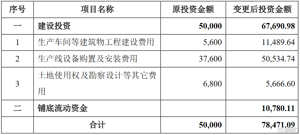 1、项目固定资产(含购买土地使用权)建设投资金额由50000万元变更为67690.98万元,同时增加铺底流动资金 10780.11万元,投资总额变更为78471.09万元。具体变更情况如下表(金额:万元):