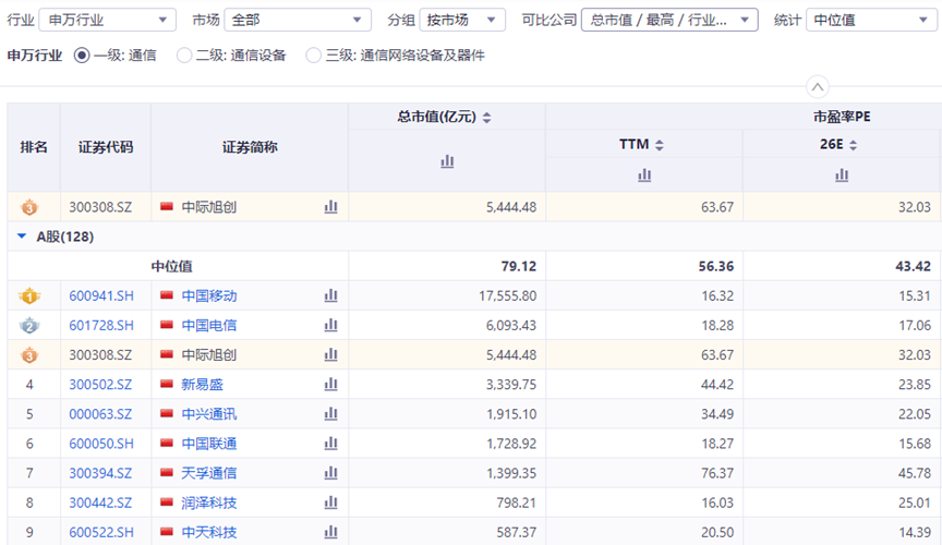 中际旭创目前的A股市值长期维持在高位,通信行业(申万行业分类一级)中,中际旭创的市值高居第三,仅次于中国移动和中国电信,但市盈率63.67远高于前两家公司,也显著高于行业中位值56.36,而分析师预测其明年的市盈率会下降约一半至32.03。