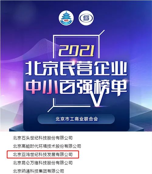北京民营企业百强榜单是发现、表彰引领产业结构转型升级、优化营商环境、扩大社会投资、推动民营经济立足首都城市战略定位等方面表现优秀的民营企业。此次,亚鸿世纪入选“北京民营企业科技创新百强榜”榜单是对我司多年来坚持技术研发和创新的肯定。