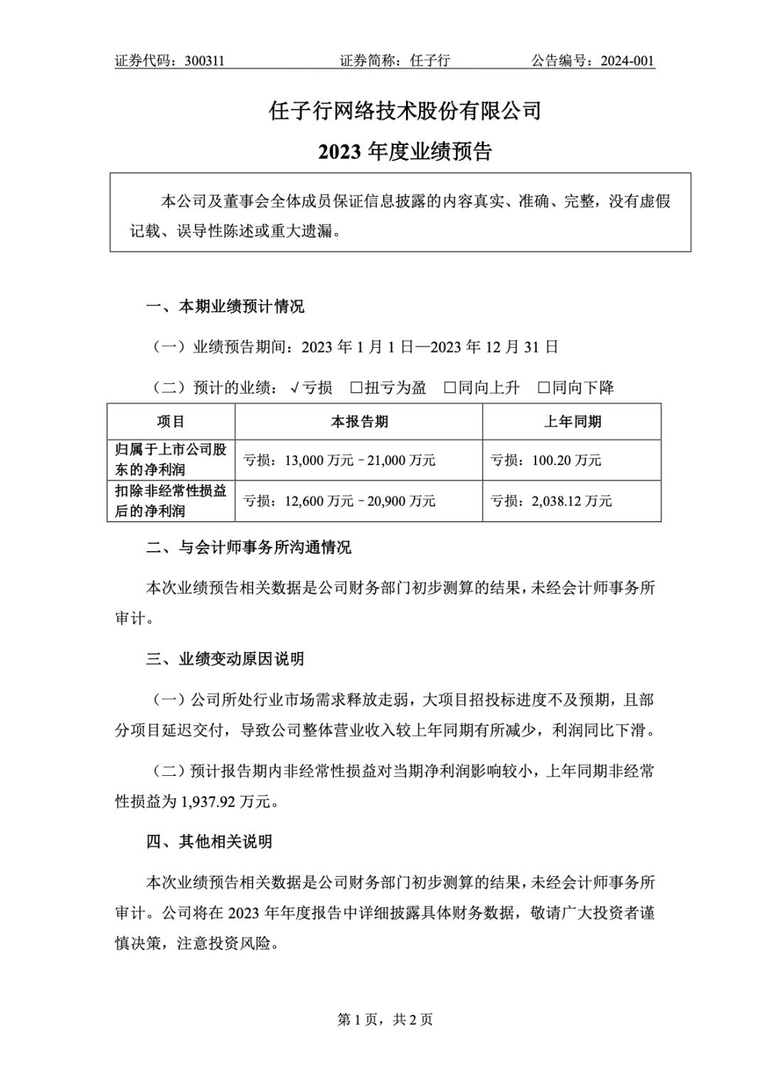 2024年1月30日,任子行网络技术股份有限公司发布《2023 年度业绩预告》。