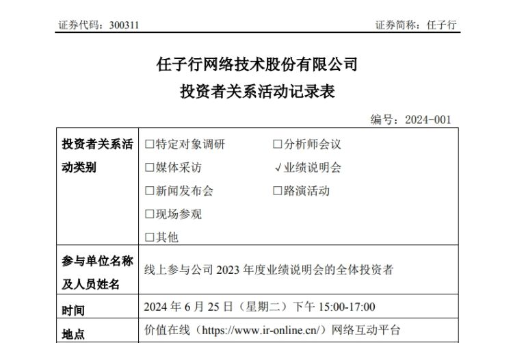 任子行网络技术股份有限公司(证券代码:300311;证券简称:任子行)6月25日发布投资者关系活动记录表,公司于当日举行2023 年度业绩说明会。说明会上,任子行表示,公司所处行业市场需求释放走弱,网络安全业务的拓展和产品交付不及预期。公司项目合同落地进度滞后,项目周期拉长,收入确认周期滞后,导致公司整体营业收入减少,成本增加,利润不及预期。未来公司将继续紧跟国家战略导向,加大向有安全需求的工业网互联企业端的市场拓展。