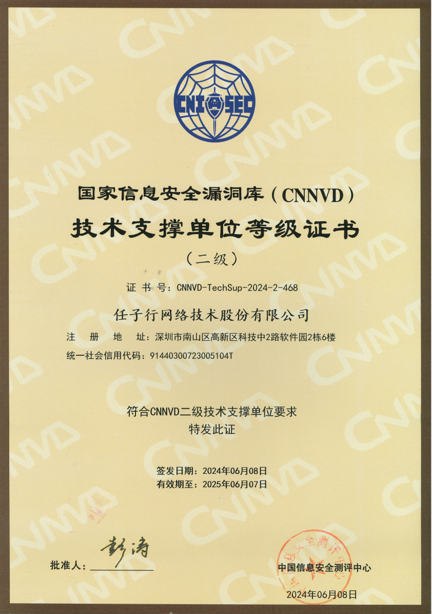 近日,国家信息安全漏洞库(CNNVD)正式发布了2024年度技术支撑单位名单。任子行公司凭借其在信息安全领域的深耕细作与卓越贡献,已连续六年获得国家信息安全漏洞库(CNNVD)技术支撑单位级别的认证,今年已成功由三级技术支撑单位提升至二级技术支撑单位。