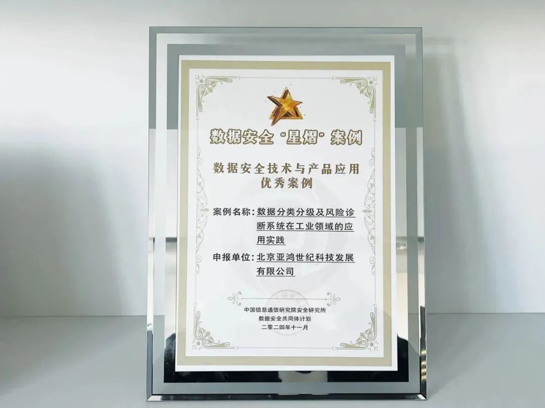 近日,“数据安全共同体计划”的“星熠”案例征集结果揭晓,任子行子公司亚鸿世纪(以下简称“亚鸿世纪”)《数据分类分级及风险诊断系统在工业领域的应用实践》成功入选“数据安全技术与产品应用优秀案例”,充分彰显出亚鸿世纪在数据安全技术实践方面的示范引领作用。