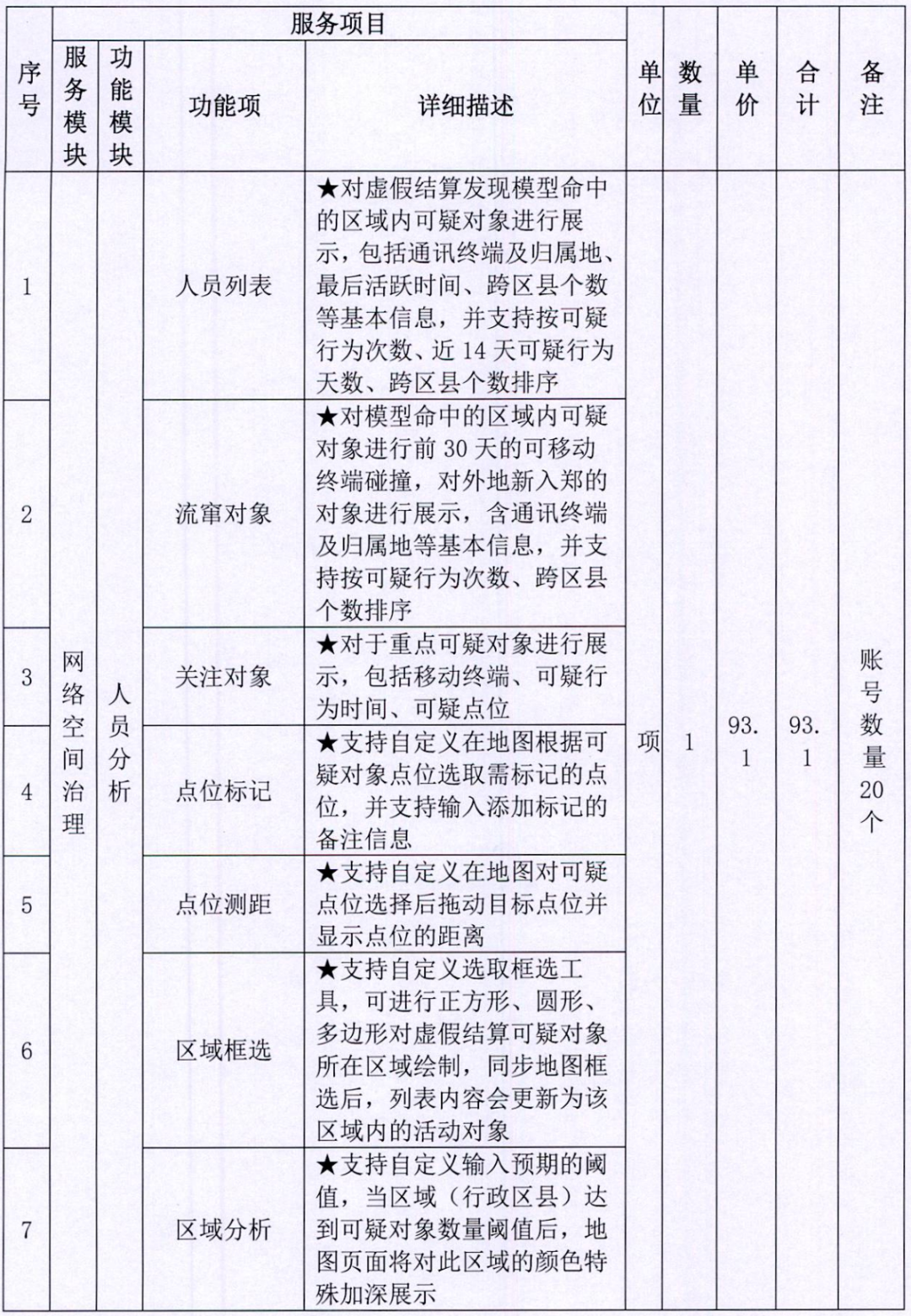 服务明细一览表: