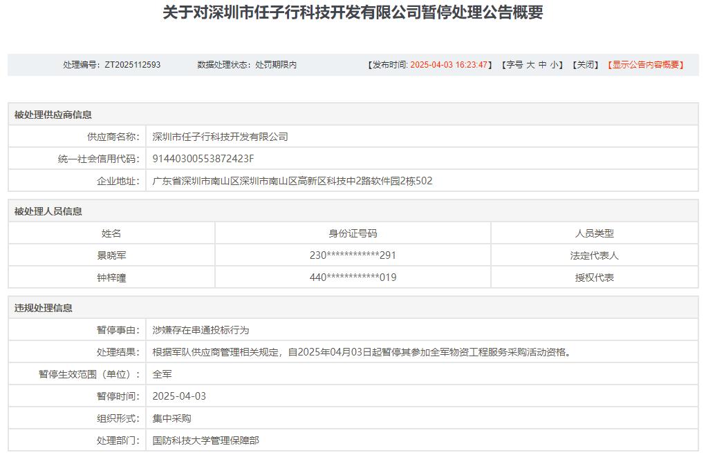 据公告,在暂停期内,深圳市任子行科技开发有限公司法定代表人景晓军控股或管理的其他企业,也将暂停参加上述范围军队采购活动,授权代表钟梓曈暂停代理其他供应商参加上述范围军队采购活动。