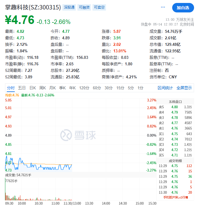 二级市场上,截至5月14日午间收盘,掌趣科技下跌2.66%,报4.76元/股,最新市值129.75亿元。和2015年5月的高位相比,公司股价已跌超七成。