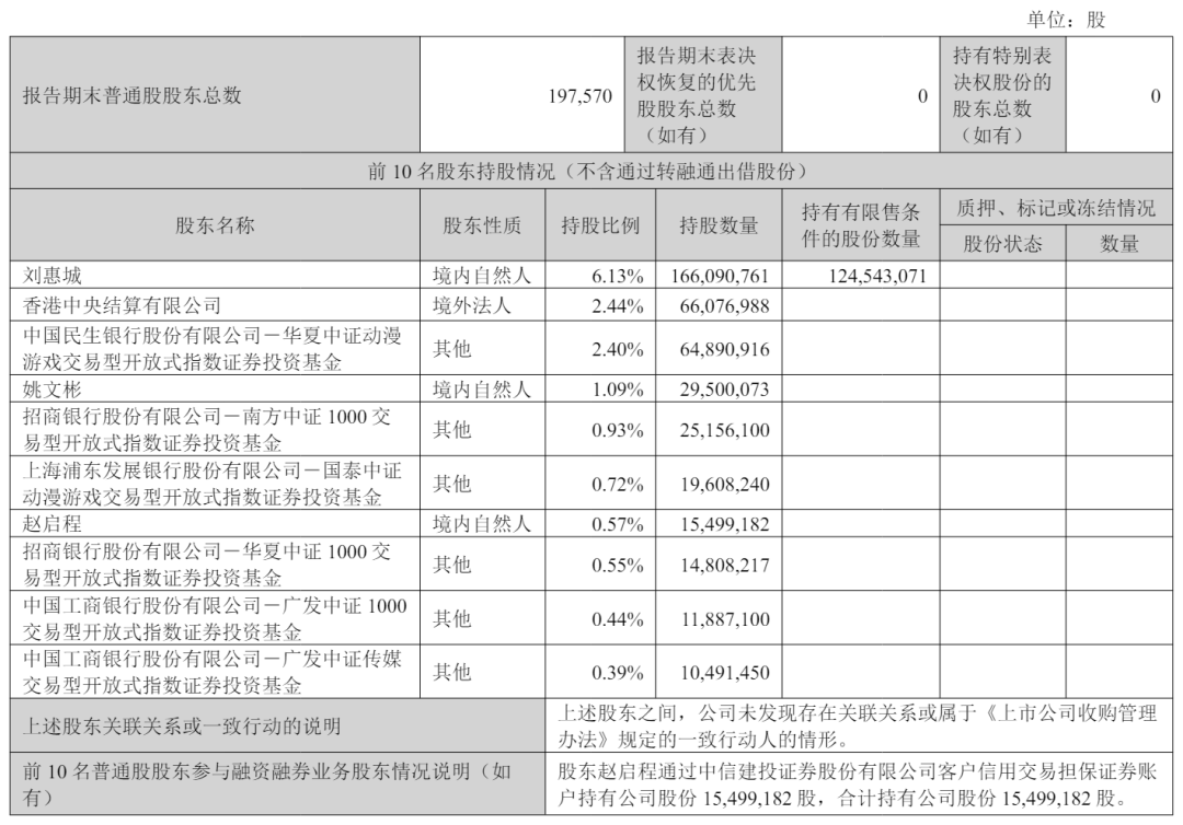 截至2024年12月31日,刘惠城持股为6.2%,香港中央结算有限公司持股为3.42%,中国民生银行股份有限公司-华夏中证动漫游戏交易型开放式指数证券投资基金持股2.04%,姚文彬持股为1.15%,中国工商银行股份有限公司-广发中证传媒交易型开放式指数证券投资基金持股为0.83%,赵启程持股为0.57%,上海浦东发展银行股份有限公司-国泰中证动漫游戏交易型开放式指数证券投资基金持股为0.56%;