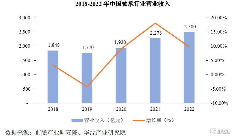 根据前瞻产业研究院报告显示,2021年,中国轴承行业营业收入达到2278亿元,同比增长18.03%;2022年,中国轴承行业营业收入达到2500亿元,同比增长9.7%,从长期来看国内轴承行业的发展前景乐观,仍然会维持增长态势。