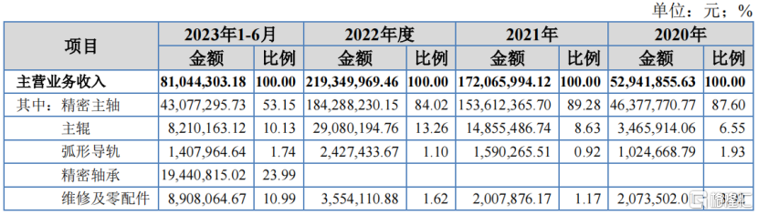 2020年、2021年、2022年、2023年1-6月(报告期),公司主营业务产品精密主轴、主辊、弧形导轨和精密轴承合计占主营业务收入的比例分别为96.08%、98.83%、98.38%和89.01%。
