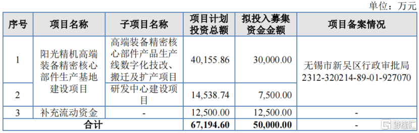 阳光精机此次拟募集资金5亿元,其中3.75亿元用于阳光精机高端装备精密核心部件生产基地建设项目,1.25亿元用于补充流动资金。