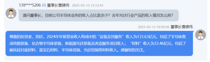 晶盛机电财报中并没有明确列示半导体和光伏细分产品的收入情况。在近日举行的2024年度业绩说明会上,有投资者向公司提问“主营业务产品半导体装备、半导体衬底材料、半导体耗材和零部件中应用于光伏行业的营业收入占比是多少,以及同比情况”、“半导体业务的收入占比是多少?去年光伏行业产品的收入情况怎么样”,但未得到晶盛机电的明确回应。