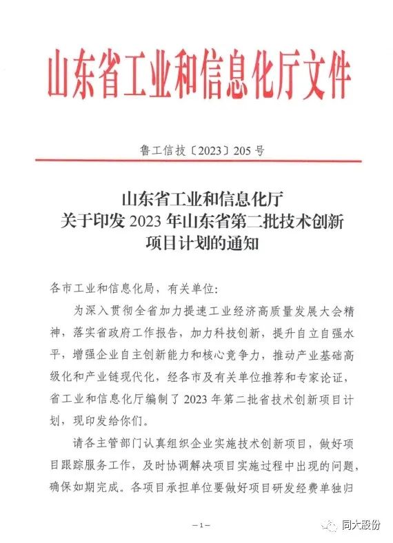 近日,同大股份技术项目《水开纤水性聚氨酯生态超纤革的开发与应用》《耐热黄变锦纶仿麂皮超纤革》成功入选2023年山东省第二批技术创新项目计划(鲁工信技【2023】205号)。