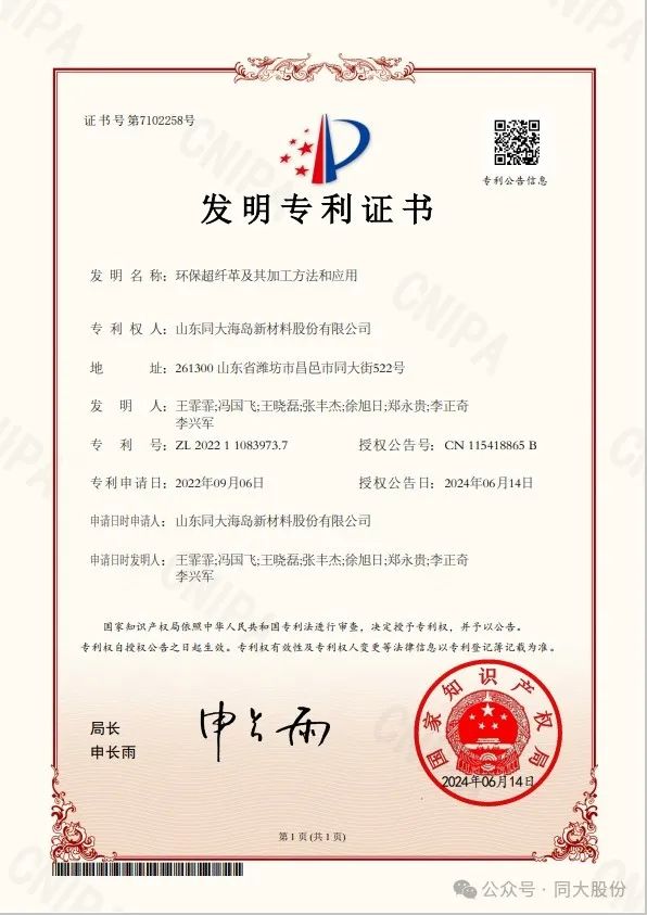 近期,同大股份成功获得一项重大发明专利——“环保超纤革及其加工方法和应用”,专利号为ZL 2022 1 1083973.7。此项专利提供一种全新的环保超纤革加工方法,在完成基础性能的同时还可以降低空气中的有害物质,起到净化空气的作用,为鞋履、汽车、箱包等行业提供更加环保、高效的新材料。