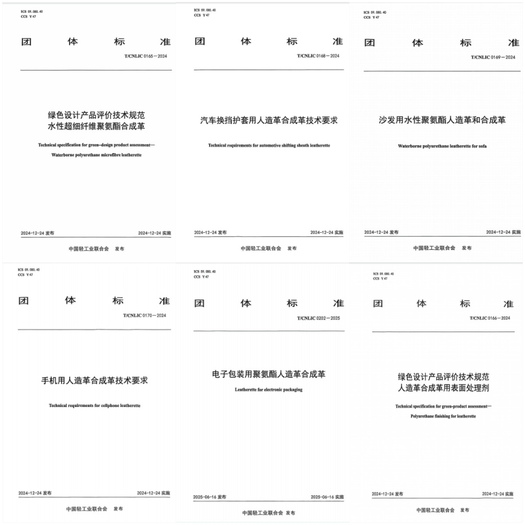 此次发布的六项团体标准涵盖多个领域,具体包括《电子包装用聚氨酯人造革合成革》(T/CNLIC0202-2025)、《绿色设计产品评价技术规范人造革合成革用表面处理剂》(T/CNL0166-2024)、《绿色设计产品评价技术规范水性超细纤维聚氨酯合成革》(T/CNL0165-2024)、《汽车换挡护套用人造革合成革技术要求》(T/CNL0168-2024)、《沙发用水性聚氨酯人造革和合成革》(T/CNL0169-2024)、《手机用人造革合成革技术要求》(T/CNL0170-2024)。这些标准的出台,将为相关产品的生产、质量控制和市场监管提供重要依据,有力推动行业的规范化和高质量发展。