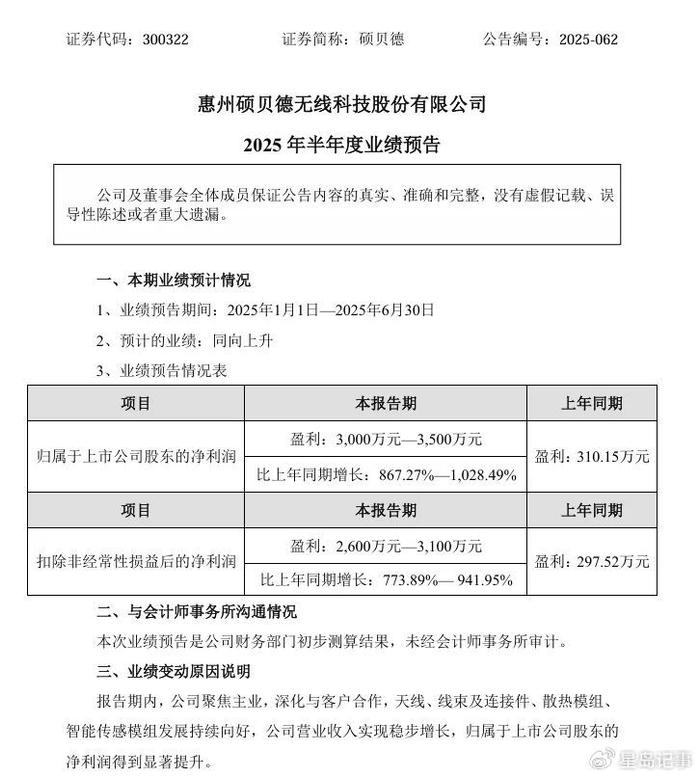 据硕贝德7月14日发布的《2025 年半年度业绩预告》显示,经财务部门初步测算,上半年实现归属于上市公司股东的净利润为3,000万元-3,500万元,与上年同期相比增长867.27%-1,028.49%,扣除非经常性损益后的净利润为2,600万元-3,100万元,与上年同期相比增长773.89%-941.95%。