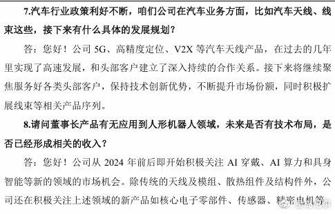 此外,就人形机器人领域的技术布局问题,朱坤华表示,公司从2024年前后即开始积极关注AI穿戴、AI算力和具身智能等新的领域的市场机会。除传统的天线及模组、散热组件及结构件外,公司还在积极关注上述领域的新产品如核心电子零部件、传感器、精密电机等。